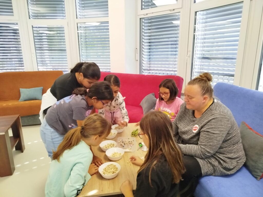 Po přivítání nás průvodkyně provedly celým domem a seznámily nás s jeho pravidly i nabídkou zajímavých kroužků. Poté už si děti mohly vyzkoušet různé aktivity. Hrály stolní tenis a stolní fotbálek, navlékaly barevné korálky a v kuchyňce si z připravených surovin a spousty čerstvé zeleniny připravily vlastní svačinku.