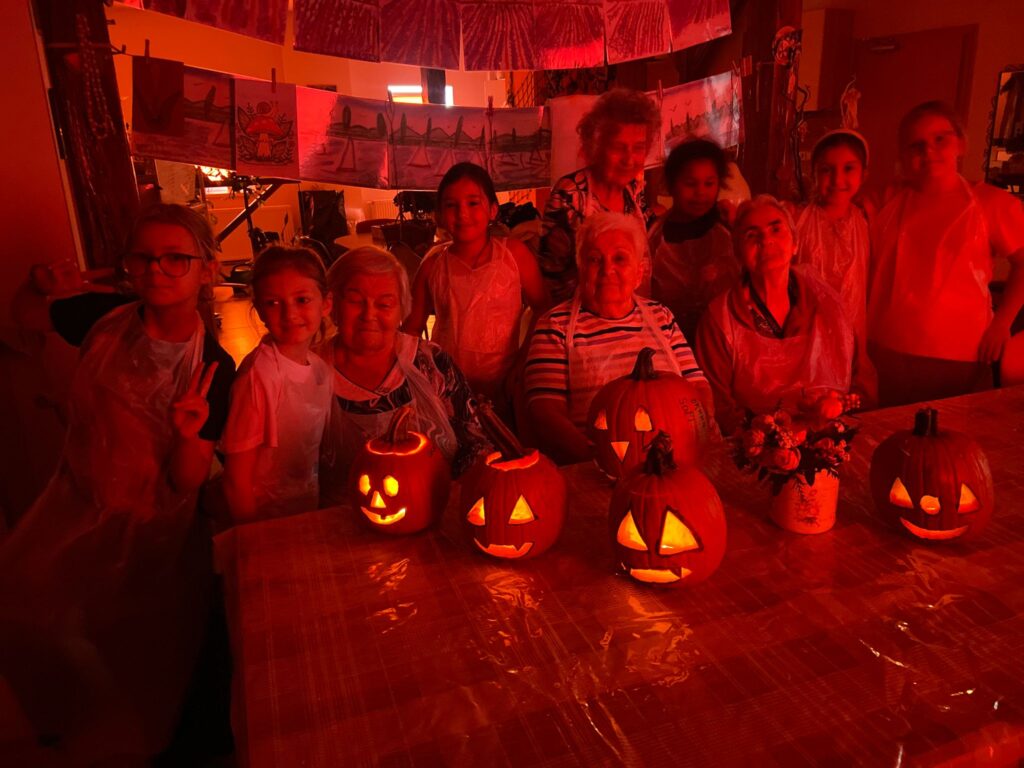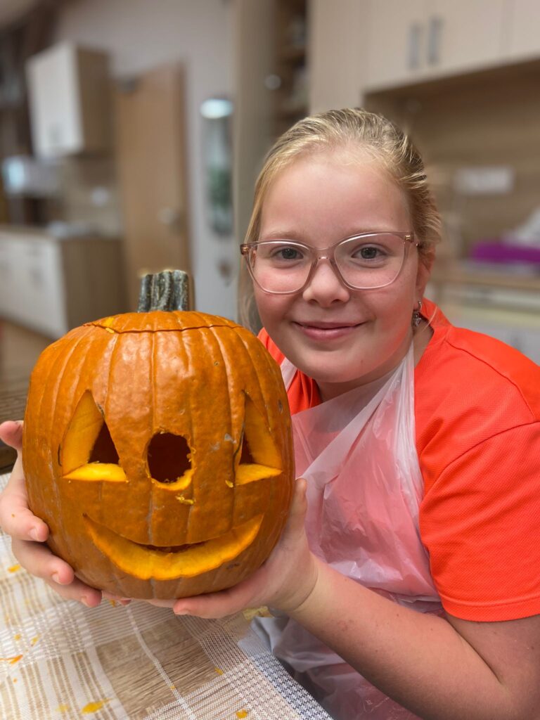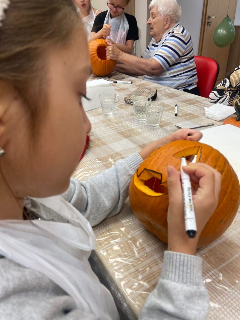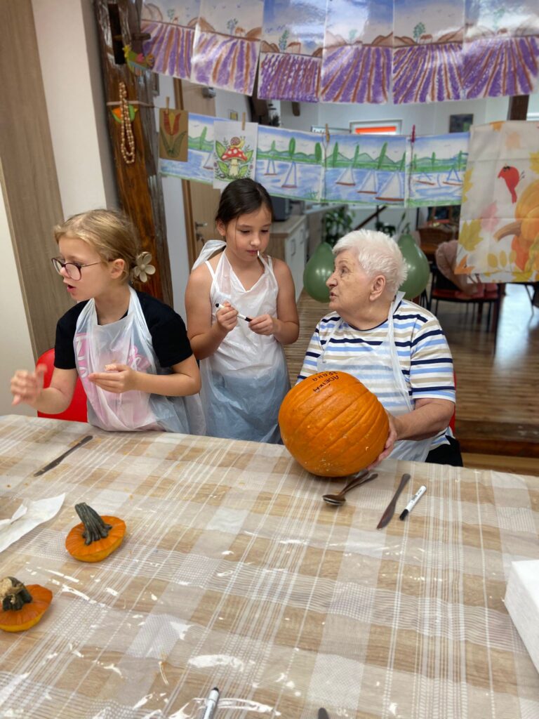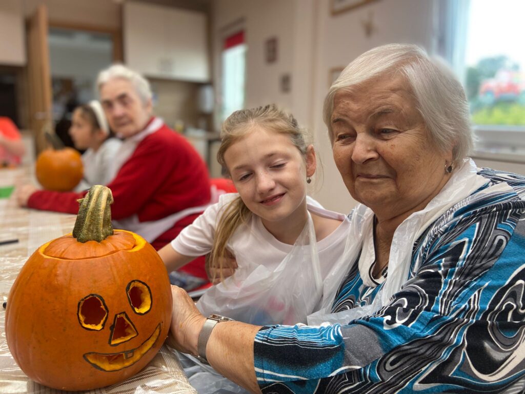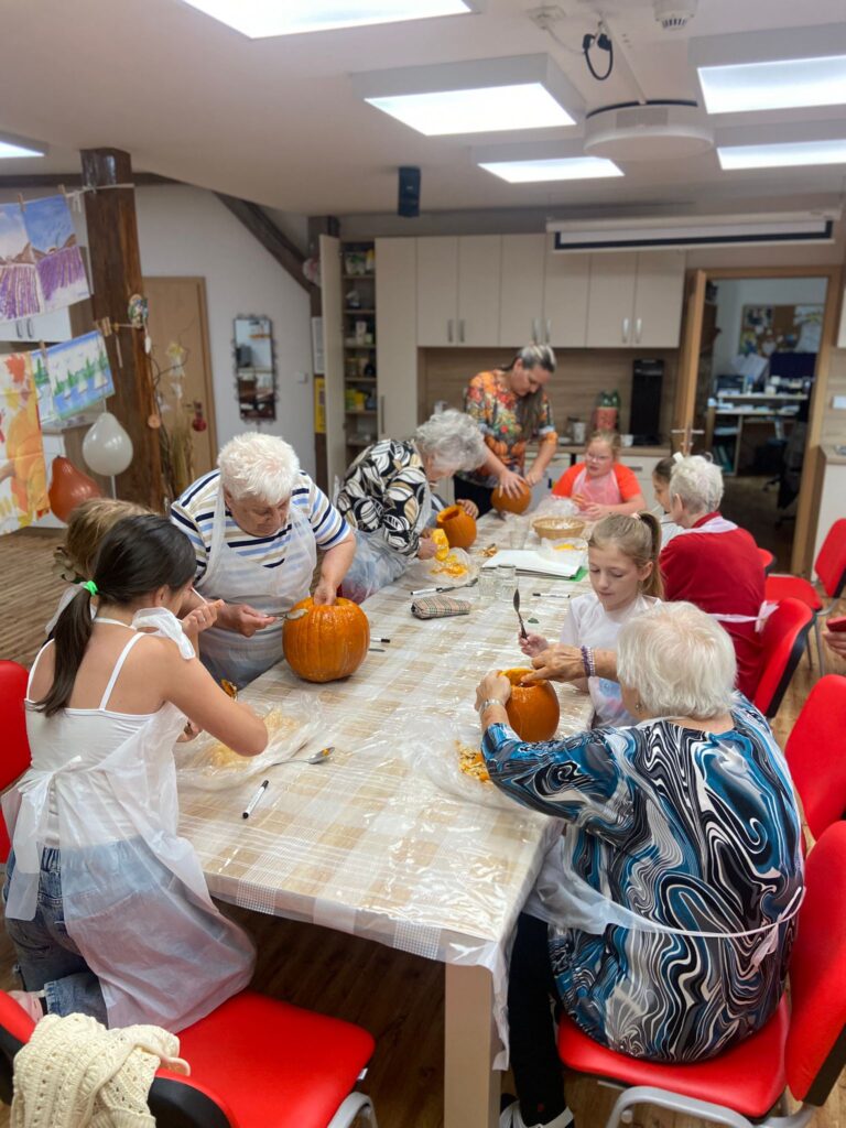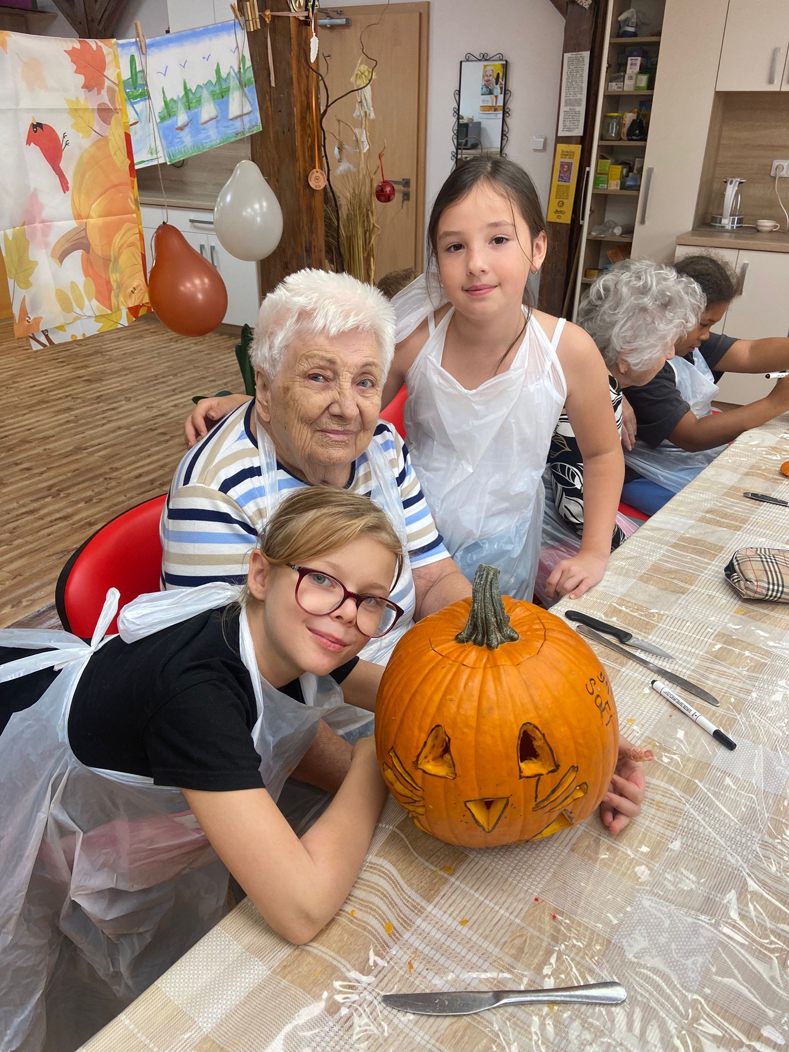 Po malém občerstvení se každá z našich dívek posadila ke stolu s jednou babičkou a společně se pustily do dlabání dýní. Vznikla tak krásná setkání plná rozhovorů, smíchu, radosti a tvořivé spolupráce. Děti i senioři se s velkým nadšením pustili do práce a pod jejich šikovnýma rukama vznikaly originální dýňové příšerky, které rozzářily nejen podzimní stůl, ale i všechny přítomné tváře.
