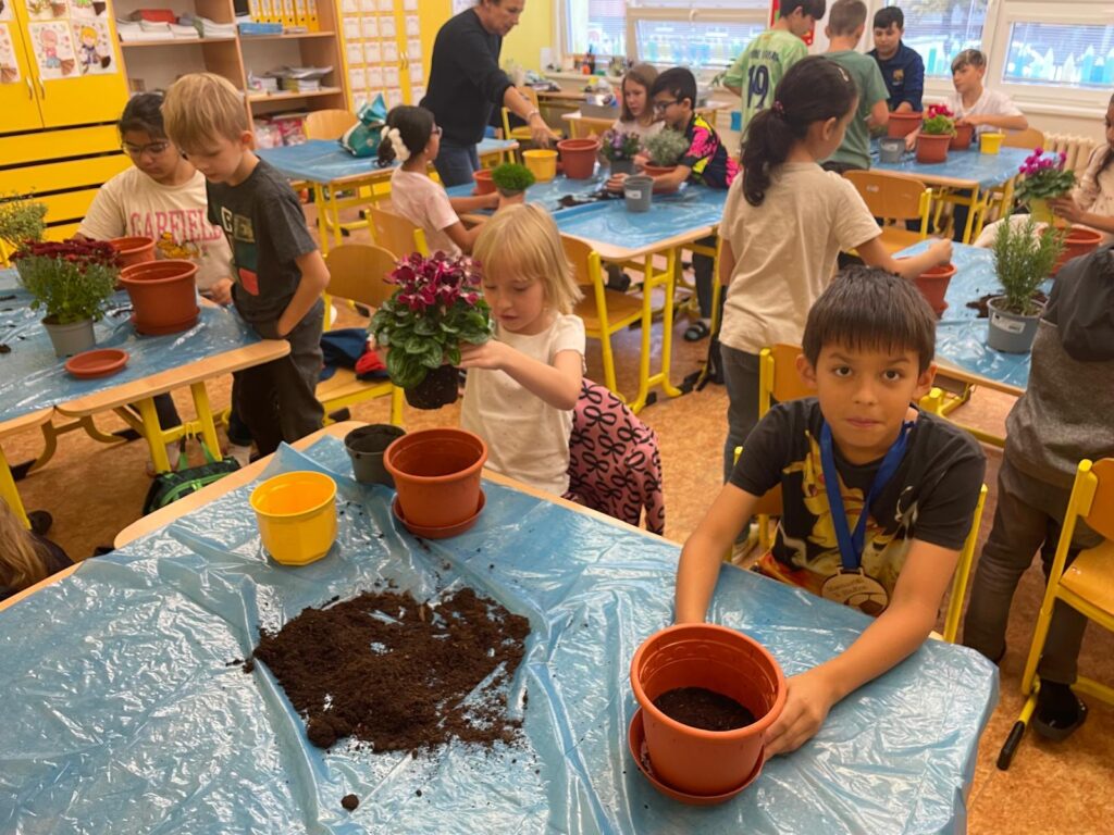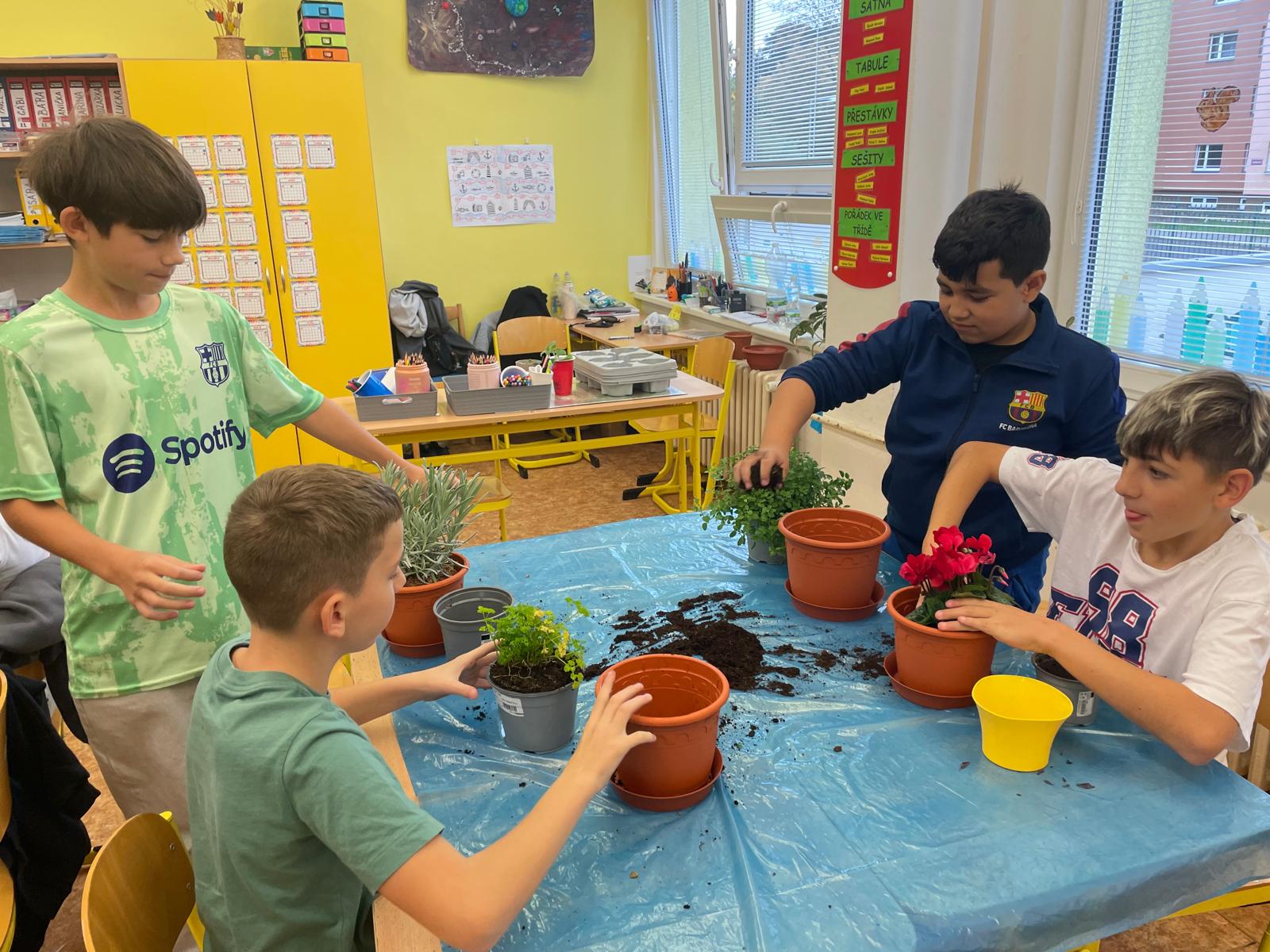 Následně jsme dokoupili hlínu a květináče a v hodinách pracovních činností se pustili do přesazování. Během práce jsme si v přírodovědě zopakovali části rostlin i to, co rostliny potřebují k životu. Každý žák si vybral „svou“ rostlinu, o kterou se bude starat s péčí řádného hospodáře.