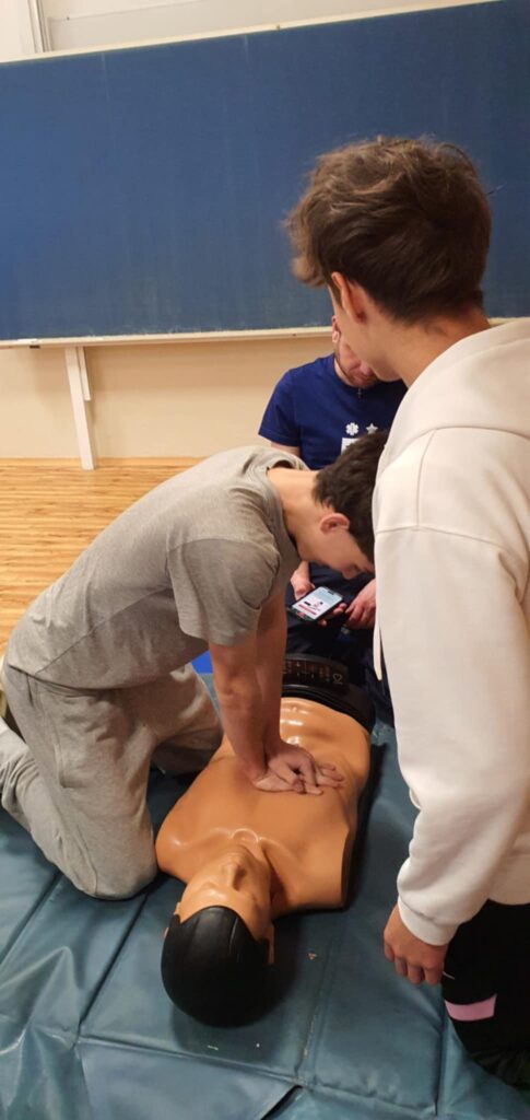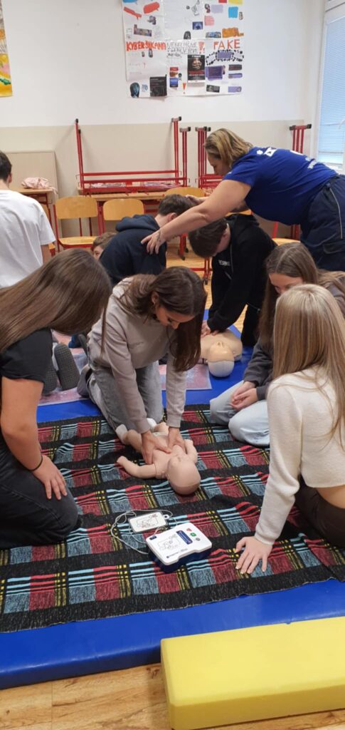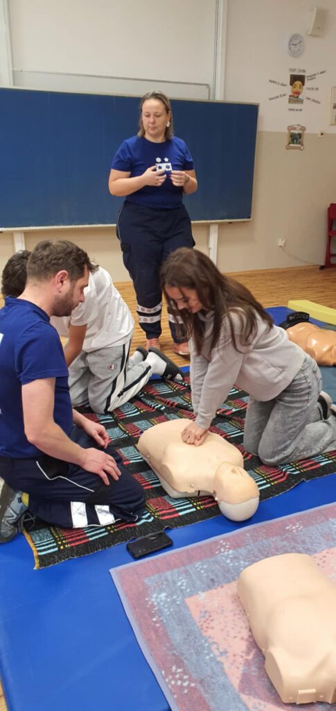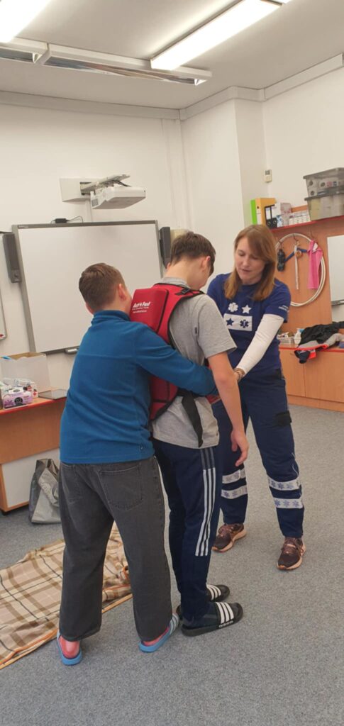 Dne 18. 11. 2025 se žáci 9. třídy zúčastnili praktického školení zaměřeného na první pomoc, které bylo součástí školního projektu. Cílem bylo seznámit je se základními principy a technikami, které mohou využít při ošetřování zraněných a v krizových situacích. Během školení se žáci seznámili s různými typy krvácení a poranění, naučili se správné postupy při jejich ošetření a vyzkoušeli si resuscitaci na figuríně. Instruktoři jim ukázali správnou techniku stlačování hrudníku a umělé dýchání. Dále se děti dozvěděly, jak pomoci osobám, které se dusí, a jak se správně zachovat v krizových situacích. Součástí projektu byla také návštěva školního krytu CO, kde žáci byli informováni o zásadách evakuace a chování v případě mimořádné situace. Projekt „První pomoc“ byl pro žáky velmi přínosný a zábavný. Praktické ukázky a cvičení jim pomohly získat cenné dovednosti, které mohou využít v reálném životě. Děkujeme záchranářům z organizace Hvězdy života za skvělé školení a těšíme se na další podobné projekty