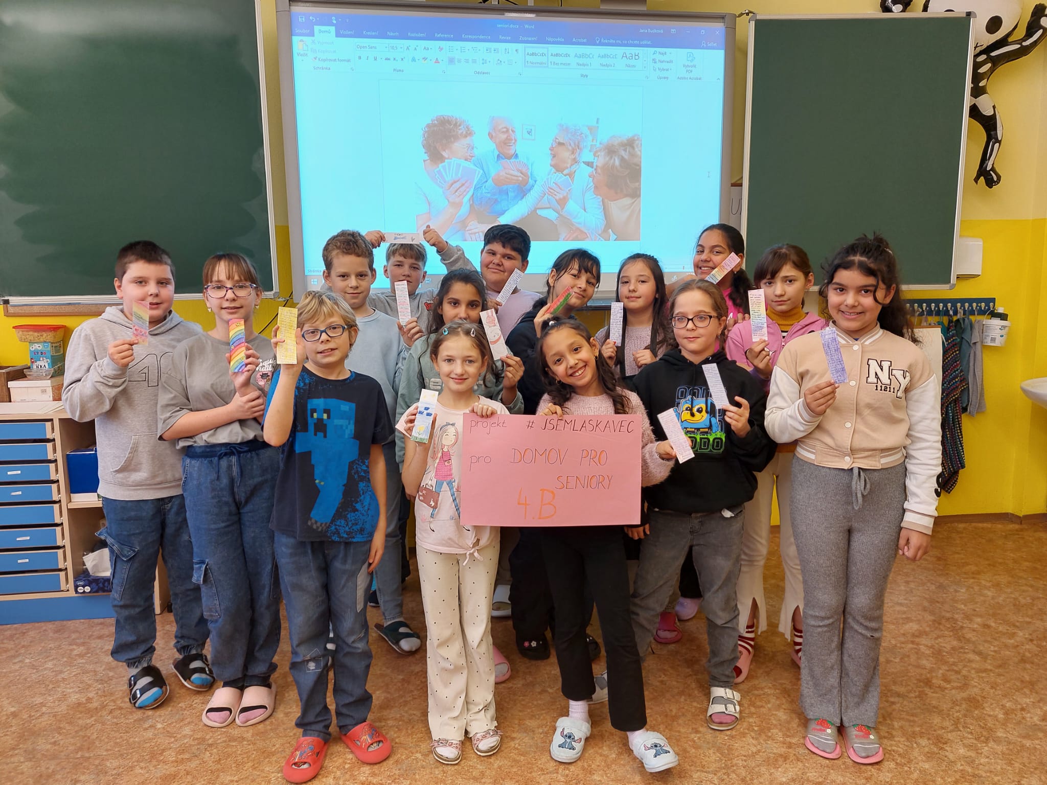4.B se zapojila do projektu #jsemlaskavec, jehož cílem je rozdávat radost druhým. Tento happening probíhá v měsíci listopad, na který připadá i den laskavosti. My jsme si vybrali 4 dobré skutky, pomocí nichž budeme v listopadu šířit laskavost. Naším druhým skutkem bylo vyrobit záložky do knížky pro seniory s několika přáními do života. Bylo krásné sledovat, jak žáci projevují empatii a přejí seniorům nádherné věci. Na mnoha záložkách se objevila srdíčka, i přestože seniory vůbec neznají. Záložky poputují do Domova pro seniory Teplice U Nových lázní a jsem si jistá, že jim vykouzlí úsměv na tváři pokaždé, když knihu otevřou.
