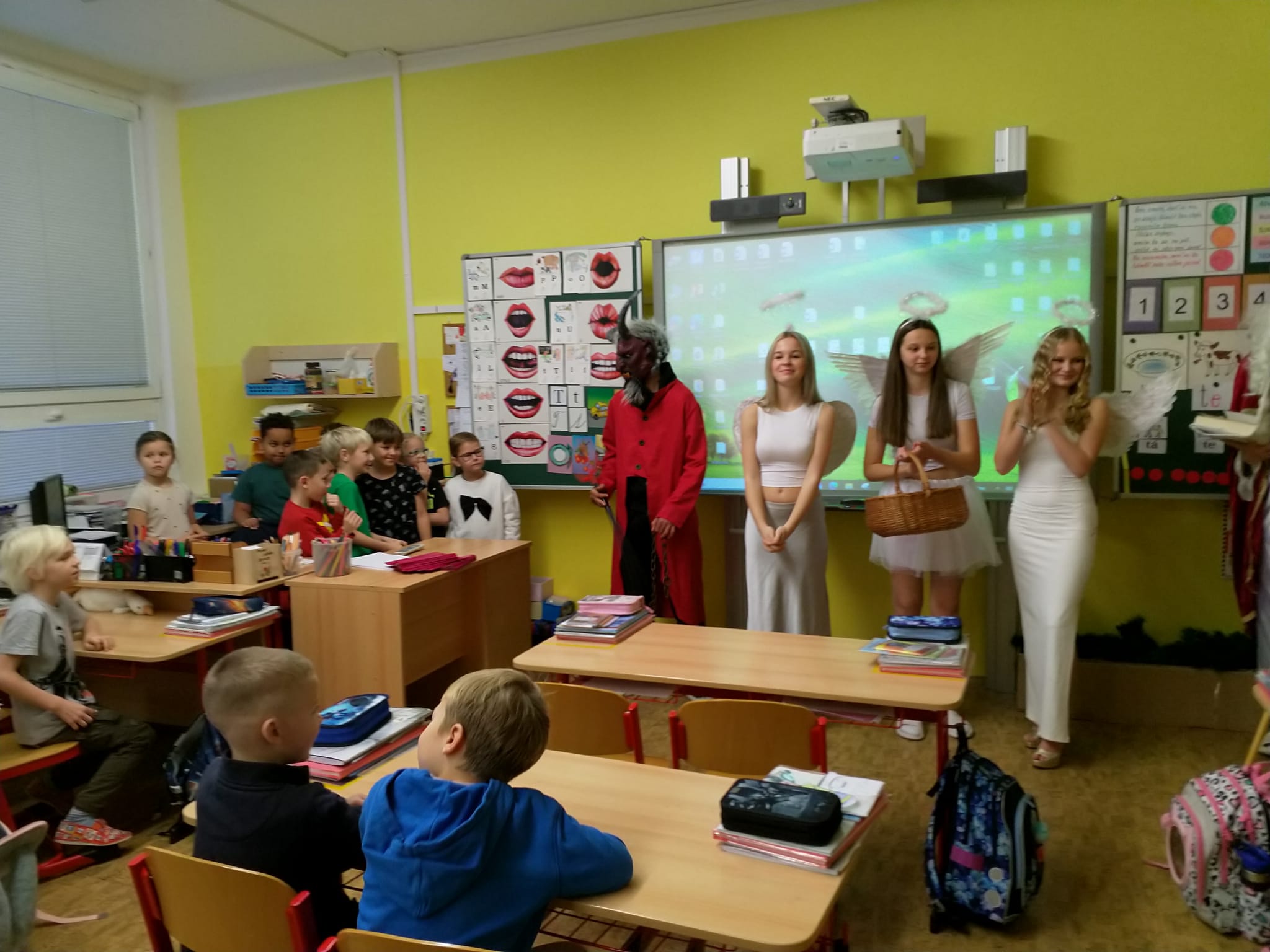 Některé děti se před čertíky schovaly za stůl paní učitelky, kde se cítily v bezpečí, jiné statečně zůstaly ve svých lavicích. Mikuláš dětem poděkoval za jejich snahu a pilnou práci ve škole a obdaroval je novými pery. A s nimi se jim pak psalo jedna radost!