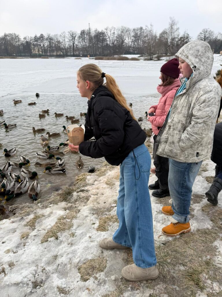 Ve středu 21. 1. jsme s naší třídou 5.A. vyrazili do lesoparku v Proboštově nakrmit volně žijící ptáky a ostatní zvířecí kamarády. Přinesli jsme jim speciální krmení pro kačenky, jablíčka a mrkev pro zajíce a srnky, slunečnici i ovesné vločky. Zároveň to byla celkem výzva, jelikož lesopark byl samý led a my neměli brusle.