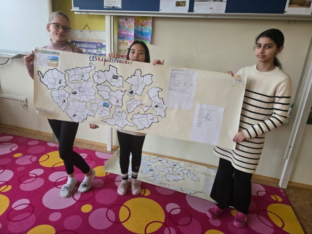V pondělí 16. 3. se u nás ve třídě celý den pracovalo ve skupinách na projektu „Naše kraje v ČR“. Každá skupina měla za úkol na velký formát vystřihnout, poskládat a pojmenovat naše kraje, dopsat krajská města podle mapy a zařadit připravené informace. Dalo nám docela práci vše poskládat a ne všechno se povedlo, ale nevadí. V M jsme počítali najeté km a v Čj jsme dávali slovesa do správných tvarů. Den nám utekl velmi rychle a ke konci jsme stihli i prezentaci.