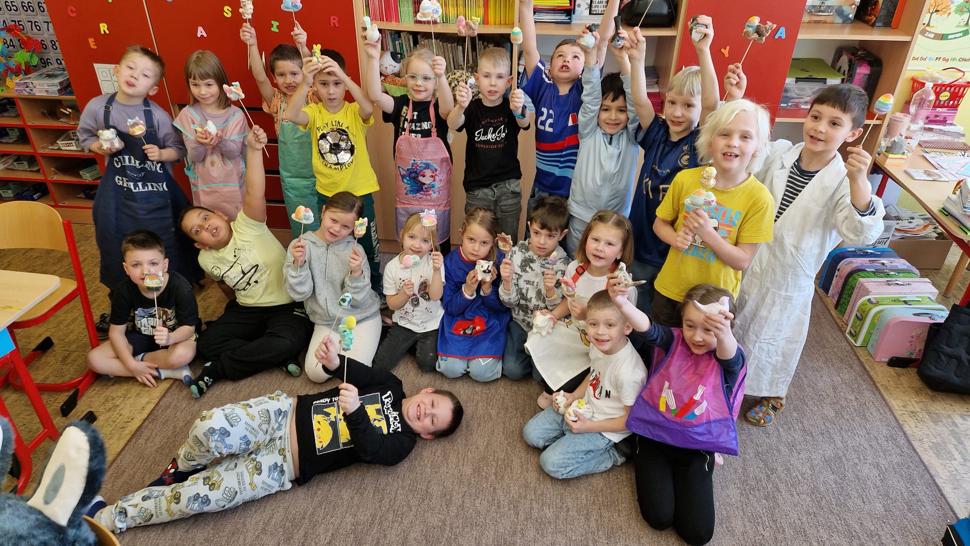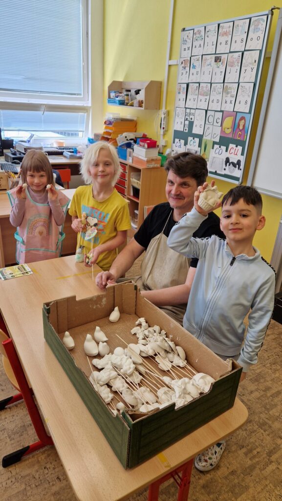 S blížícími se Velikonocemi jsme se s dětmi 1.B pustili do oblíbeného tvoření. Malovali jsme vodovkami sádrové zápichy s velikonočními motivy a vznikla spousta barevných dekorací. Každý kousek byl originální a děti měly z výsledků své práce velkou radost.
